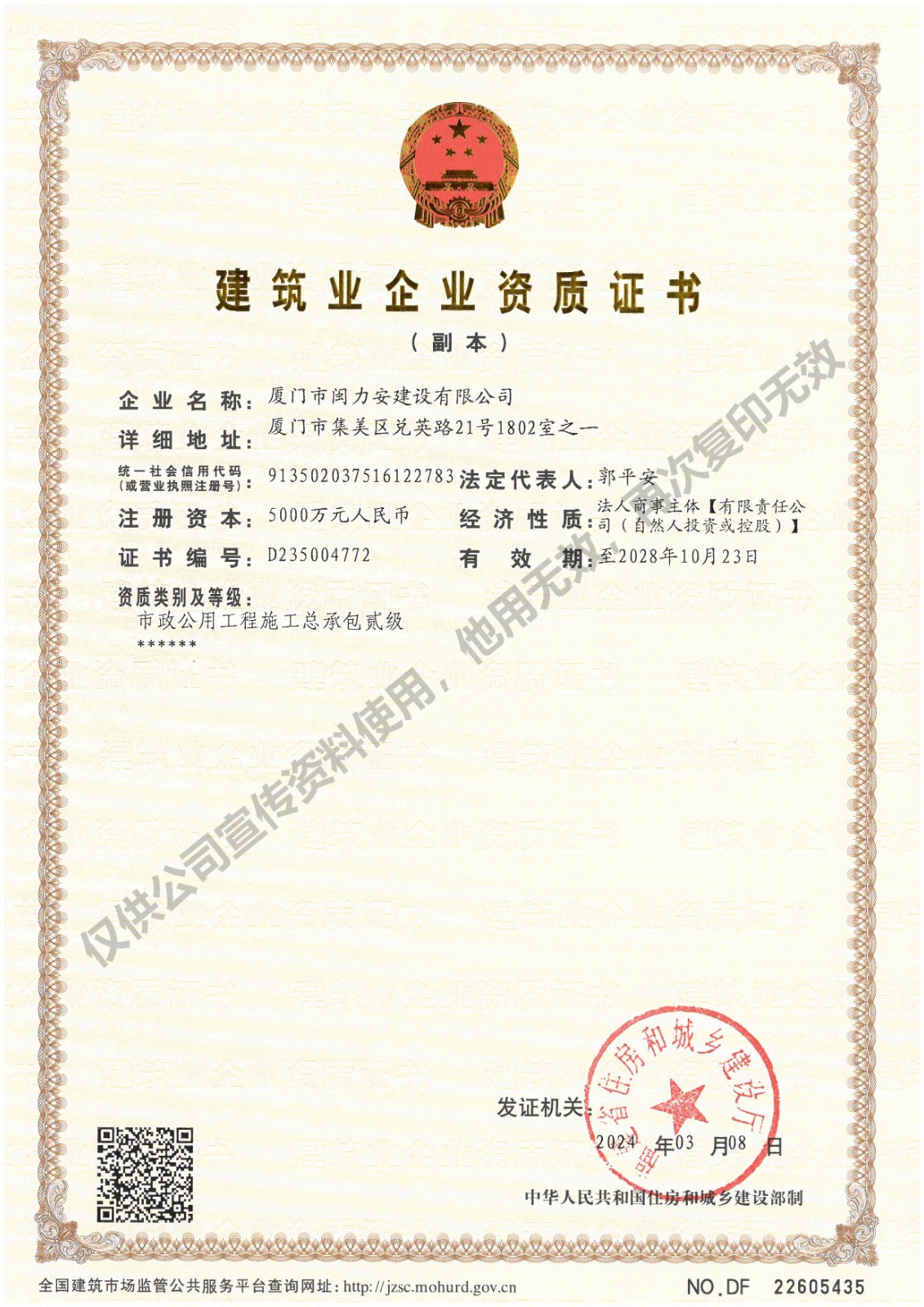祝賀閩力安取得:建筑業(yè)企業(yè)各種資質(zhì)證書發(fā)布日期:2024-08-15 瀏覽次數(shù):2580